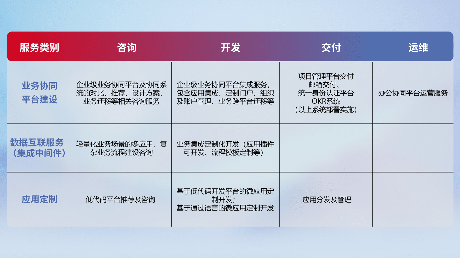 针对钉钉、、、、企微、、IDaas等平台级产品提供产品的规划、、方案、、、、交付、、定制化开发等服务,,,,实现如统一协同办公、、、、智能客户服务、、、、混合会议管理、、智能数据查询、、、、等业务场景,,实现数字化转型。。。。